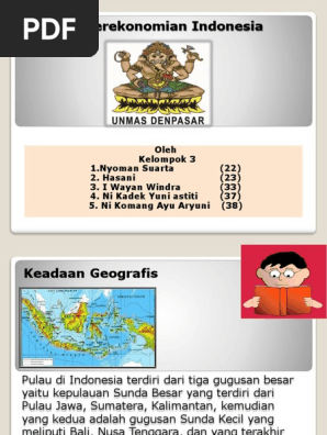 Kenyataan pertama yang harus diakui adalah bahwa indonesia merupakan negara kepulauan dengan luas keseluruhan lebih kurang 195000000 sampai dengan 200000000 juta ha. Puji syukur kami panjatkan kehadirat allah swt yang telah memberikan rahmat serta karunia nya kepada kami sehingga kami berhasil menyelesaikan makalah ini yang alhamdulillah tepat pada waktunya yang berjudul peta perekonomian indonesia. Makalah ini berisikan tentang informasi bagaimana keadaan geografis indonesia mata pencaharian sumber.